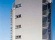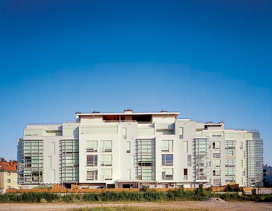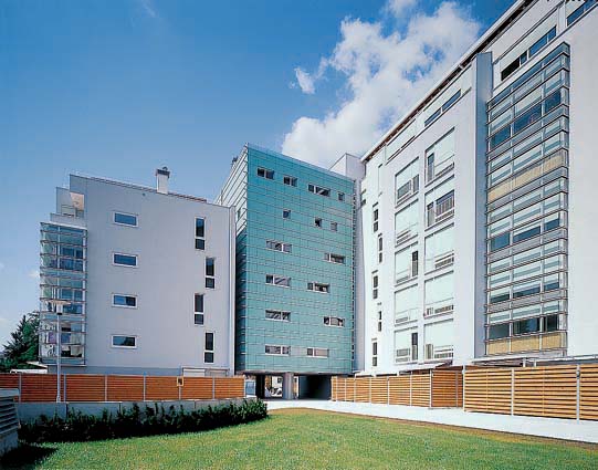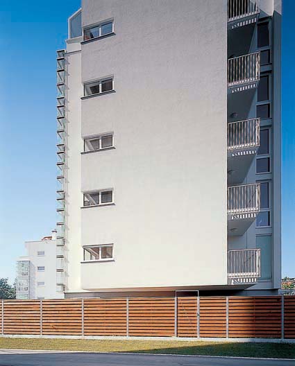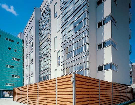 Fasadni plašč je bil zaradi skeletne zasnove objekta sprva zamišljen kot zelo lahka sendvič konstrukcija. Kasneje smo zaradi prezahtevnosti, to zamisel nadomestili z klasično fasado iz lahkega siporexa in zaključnim slojem. Kljub temu ima objekt značilno razgibano fasado, kjer dominirajo steklene vertikale med polnimi fasadnimi zidovi, v katerih so razmetane okenske odprtine. Te steklene vertikale za katerimi so zimski vrtovi in velike steklene odprtine, so posebnost objekta, ki dajejo stanovanjem več svetlobe in popoln občutek povezave z okoljem. Pri projektiranju tega objekta nam je bilo vodilo; svetloba, sonce, vedute in trasparenca. Iz zgornjih etaž je možno preko sosednjih objektov severno in zahodno videti tako vrhove Kamniških Alp in Julijcev, kot samo mesto z Gradom proti jugu. Zaradi transparence, je iz nekaterih stanovanj iz enega mesta možno uživati v kombinaciji prelepih razgledov v večih smereh.