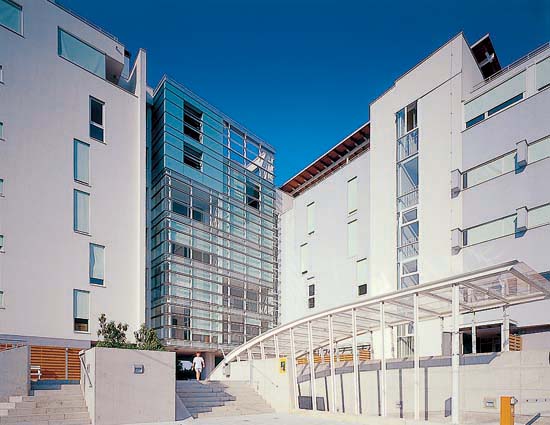 Poleg tega pa je bilo hkrati potrebno zagotoviti tudi senco in zaščito pred soncem, ter racionalno porabo energije. Pred soncem ščitijo zimske vrtove in okenske odprtine, senčniki iz tkanine, ki so skoraj enake pastelno bakreno zelene barve, kot je prej omenjena obloga sredinskega člena objekta.